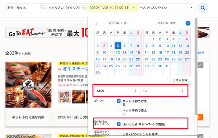 ③ 日付と時間(ランチの場合は昼の時間帯)を選び、人数は「1名」で設定して検索。