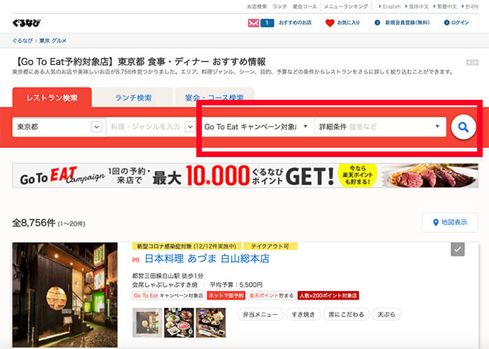 まず以下のリンクからぐるなびのGotoイートキャンペーンページにアクセスします。