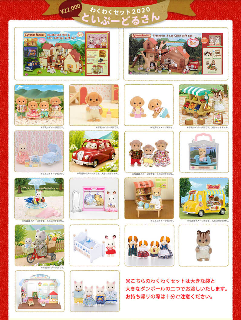 例年、値段のラインナップは5,000円、10,000円、20,000円の3つの価格帯!内容としてはお家またはお店に加えてファミリーのセット、家具など様々。かなりお得なセットになっているようですよ♪