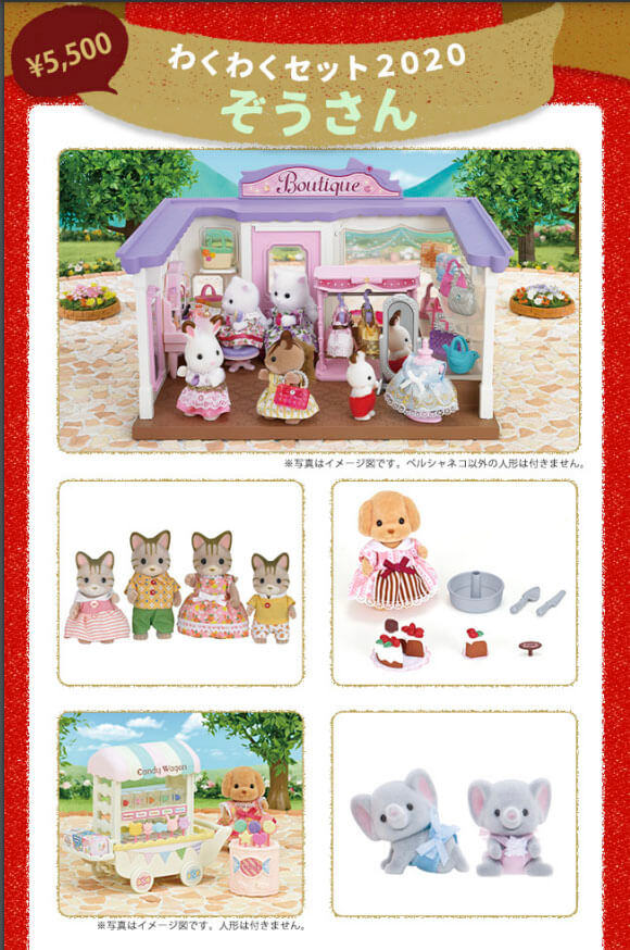 2020年のシルバニアファミリーの福袋は、「といぷーどるさん22,000円」「ぱんださん11,000円」「しふぉんいぬさん5,500円」「ぞうさん5,500円」「くまさん5,500円」など!