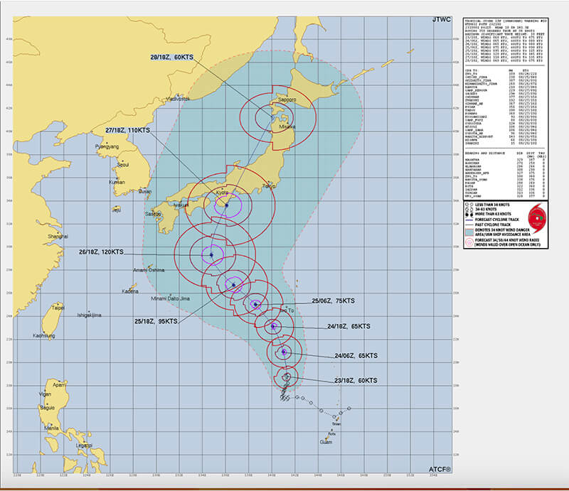 米軍JTWCの進路図は、世界協定時刻(UTC)で表示されるので、日本時間に置き換えるには9時間を足して見る必要があります。