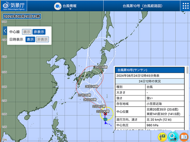 台風10号2024は小笠原近海から日本の南へと進み、紀伊半島付近から上陸〜関東へと縦断する可能性があります。