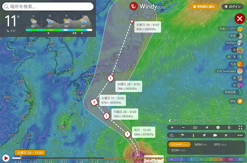 チェコが提供しているオンライン気象予報サービス「Windy」 の予報をみていきましょう。