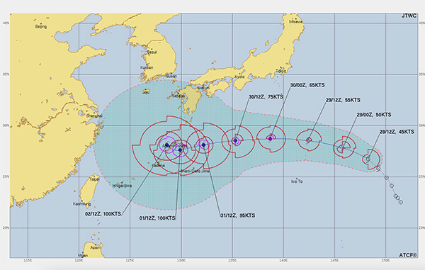 まずアメリカの米軍台風警戒センター(JTWC)の情報を見ていきましょう。