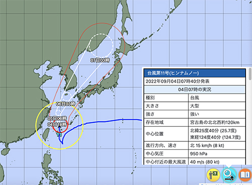 日本の南にあった台風11(ヒンナムノー)号は、9月4日7時40分現在、宮古島の北北西約120kmに位置しています。
