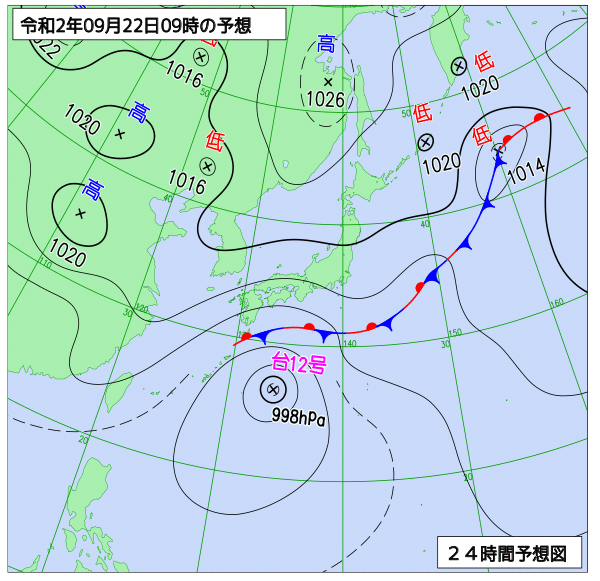 ・24日21時の予報 銚子市の東約330km (北東へ毎時15km/990hPa)