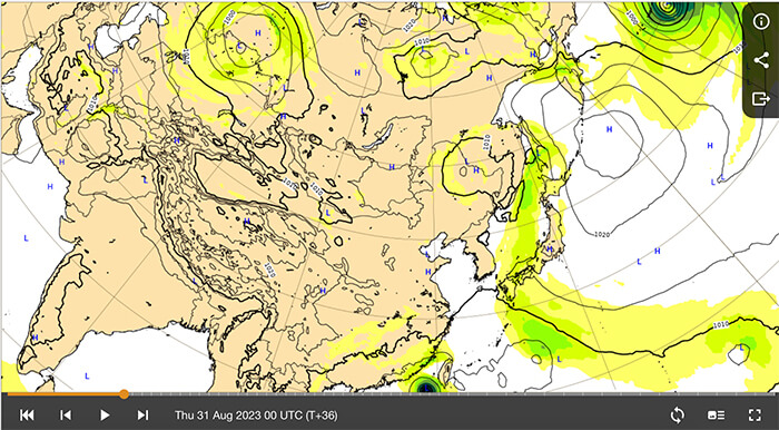 こちらでは直近の日付でも台風12号のたまごらしき姿は見えます。日付を進めて見てみると日本方面に少しずつ進んでいく様子がみれます。