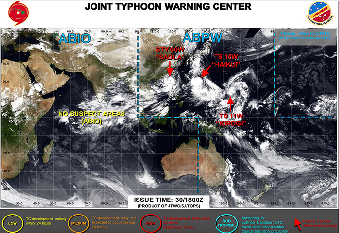 台風9号(サオラー)・台風11号(ハイクイ)・台風12号(キロギー)の3つの台風が発生しています。台風11号は今日から明後日にかけて沖縄に接近するため、高波に警戒、強風には注意が必要です。