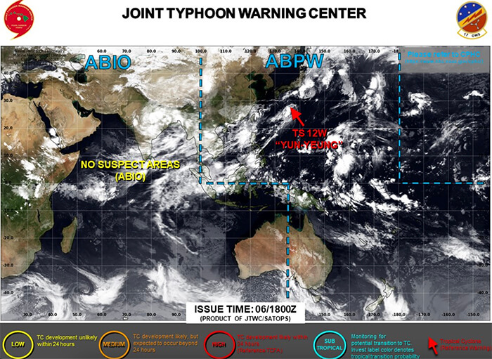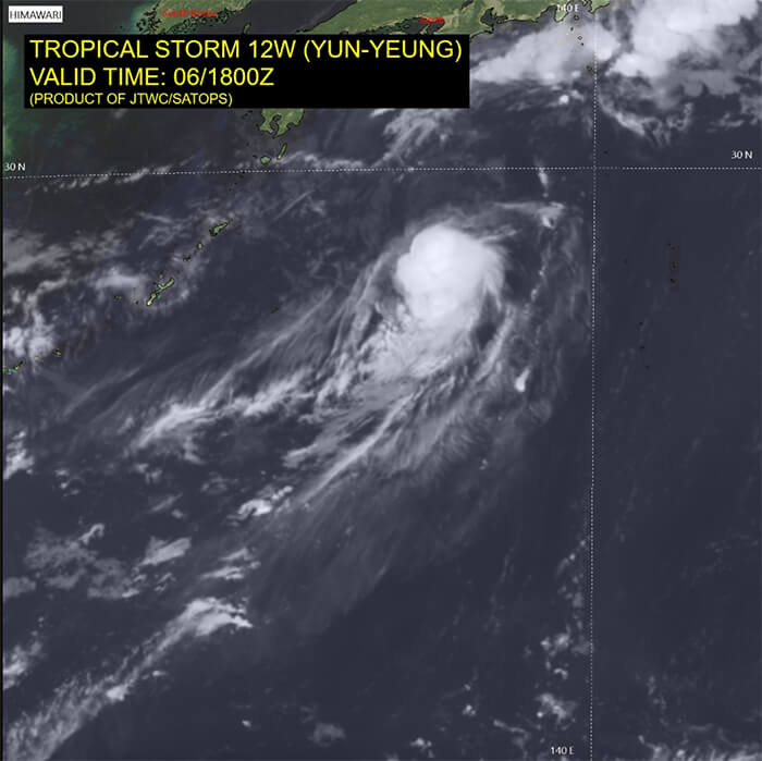 米軍JTWCの衛星図では、台風13号を赤色の矢印「TS12W “YUN YEUNG"」で捉えています。