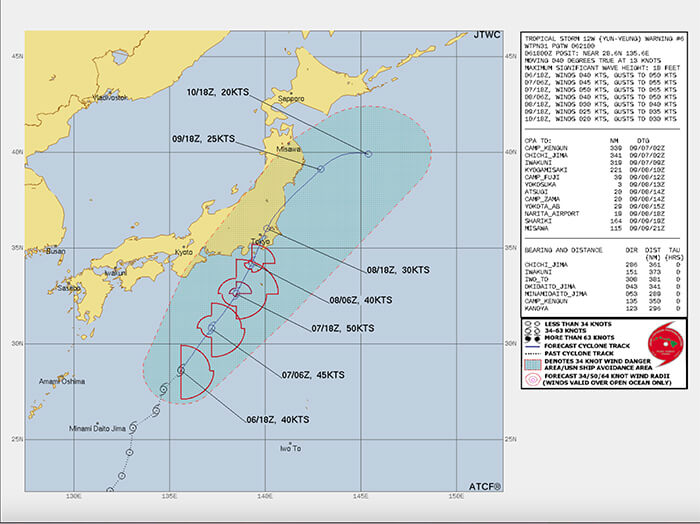 日本時間で8日の15時には関東近海に位置しているように見えますが、この時点での風速は30ノット(約15メートル)と予想されています。