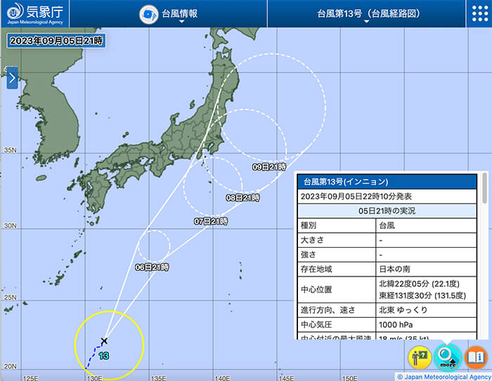 9月7日(木)6時現在、台風13号(インニョン)は日本の南を北北東に進んでいます。今日から明日8日(金)にかけて伊豆諸島では強まる風雨に注意してください。8日(金)には関東や静岡周辺などに接近・上陸する可能性があります。今後の情報にご注意を。https://t.co/lJz6qJRU1T pic.twitter.com/P32IqrEfUy