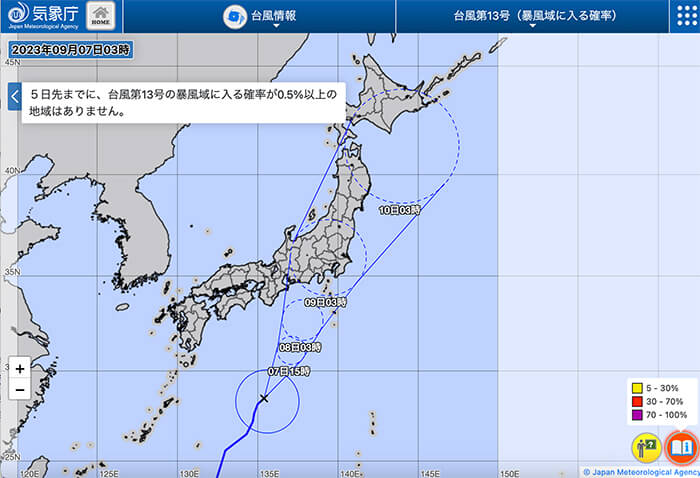 台風13号(たまごの熱帯低気圧)の暴風域に入りそうなエリアが発表されていますが、「5日先までに、台風13号の暴風域に入る確率が0.5%以上の地域はありません。」となっています。
