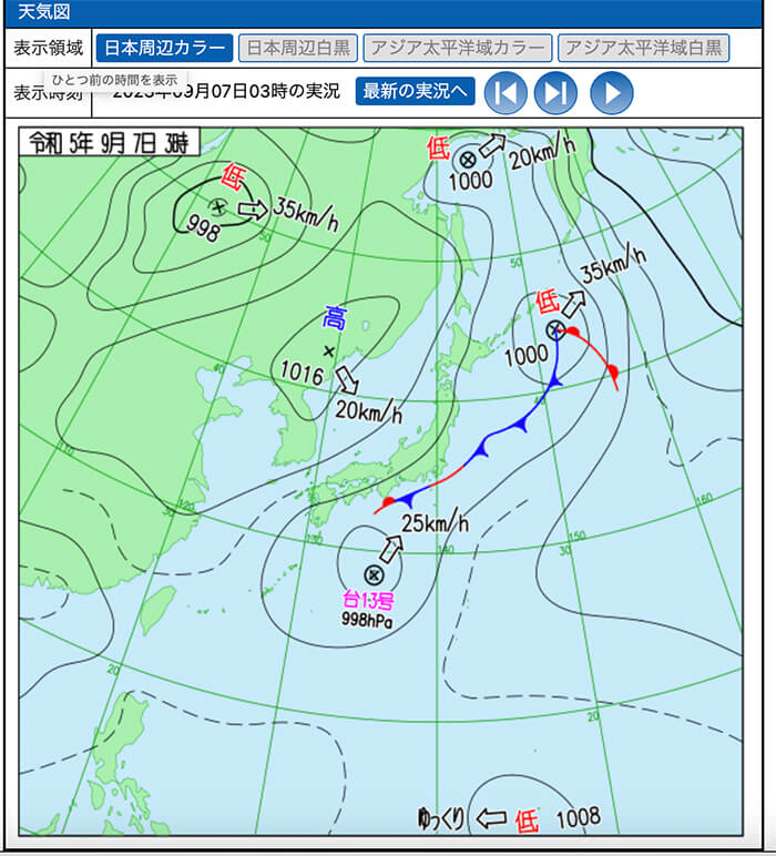 なお、熱帯低気圧(台風含む)となると「赤矢印」で記号とともに示されます。