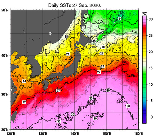また、次に台風の発生に大きく関係する「海面水温」を見てみます。