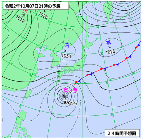 台風14号の等圧線がかなり密集し、960hPaまで下がる予報です。
