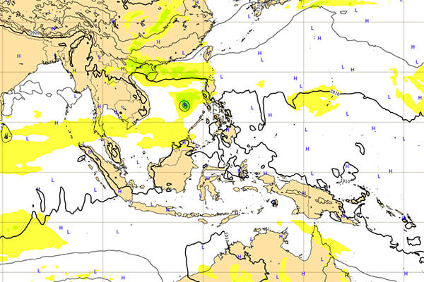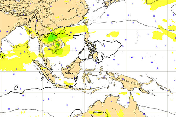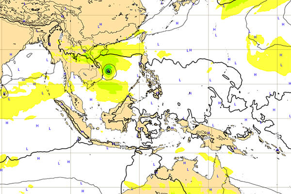 日本では、熱帯低気圧の風速が 17.2m/s を超えると「台風」とされていますが、台風になっても進路はベトナム〜ラオスと予想されており、日本への影響はないと思われます。