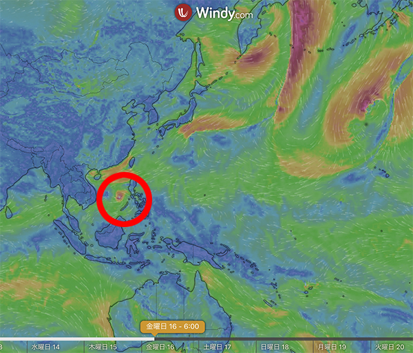 同じ場所にWindyでも風の渦を見るけることができ、台風の発生と見て取れます。