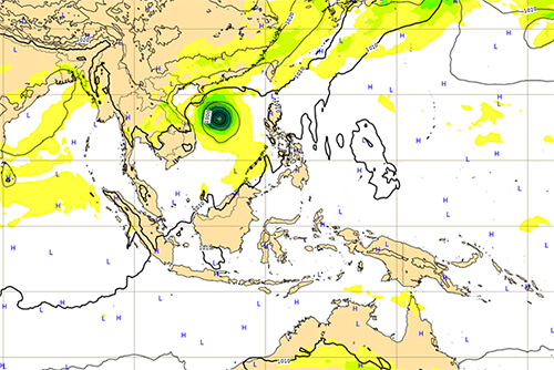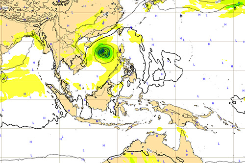 22日付近に、南シナ海に風の渦が見られ、こちらが熱帯低気圧もしくは台風である可能性があります。