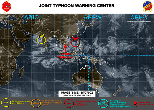 米軍では発達具合に合わせて色を変えて表示されています。現在の赤色の矢印「TS」はトロピカル・ストームの略で、最大風速が17~25m/sの台風などを言います。