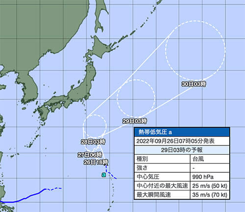 ただ台風になりそうな段階になると、まず「熱帯低気圧」として発表されますが、9月26日6時時点では「熱帯低気圧」として進路等が発表されています。