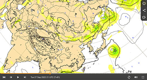 日付を進めて9月27日ごろになると日本の関東近くに台風らしき風の渦があるのが見て取れます。