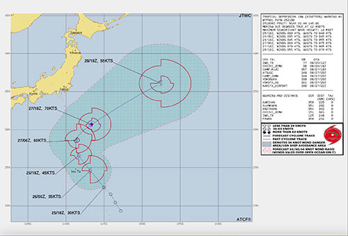 台風の前段階の熱帯低気圧の状態でも進路図が発表される場合があります。現段階ではすでに進路図が発表されています。