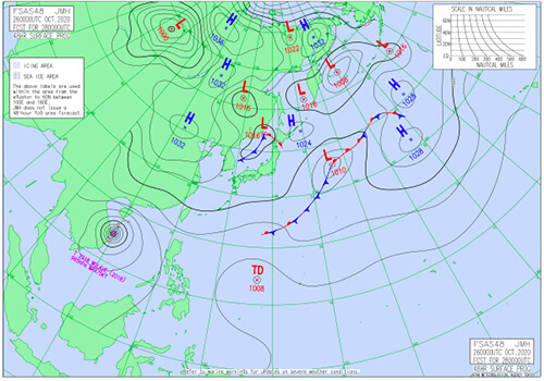 南シナ海に「TD」という赤い文字が見つけられます。こちらは「Tropical Depression」の略で、最大風速が17.2未満の熱帯低気圧となります。